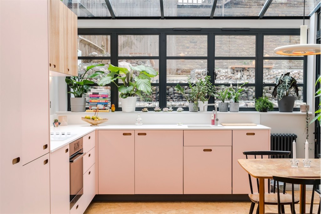 • 70s-Inspired Retro Kitchen: Pastel pink cabinetry, integrated appliances, and cork flooring added playful yet practical retro flair.
